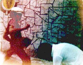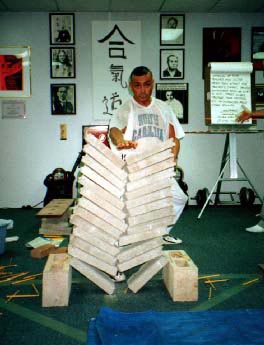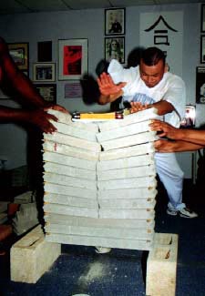 Grandmaster Soto is seen here breaking 14 bricks. He usually breaks anything from 50 bricks. |