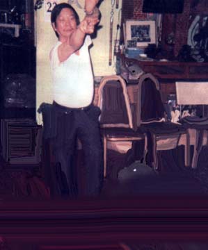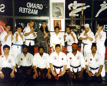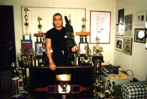 World Champion Soke Grandmaster Soto wih his championship belts, championship trophies, and hundreds of other trophies and plaques which you cannot see here. He has over 2000 trophies and plaques throughout his lifetime. This photo was taken recently in 1999.