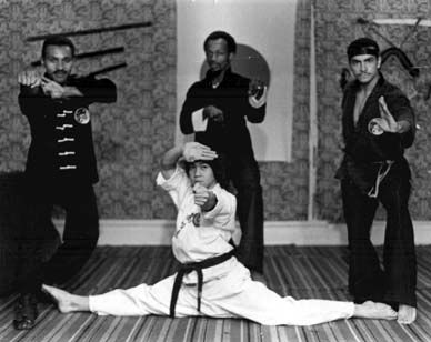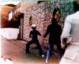 The young actor, Grandmaster Soto, starring in the Latin American movie, "A Cry in the City". in the film produced by Columbia Pictures New Artists Release Producer Tony Betancul. Above, In the scene from the movie Grandmaster Soto (On the Left with the White Hat] plays the part of a martial arts assassin hired from theLatin mafia. Starring opposite are Radio Announcer for Spanish Radio Joselando Coti (In the White Coat)--Grandmaster Soto kicked too fast for the 35mm film to catch--The director told him to slow down!; and News Anchor from Channel 41 and Channel 47 Rafael Pinela [In the black coat]. Also, Professor Soto worked in two other films by the same company. These films were made during the early 1970's when VCR's were not out yet. You can write to Columbia Pictures for more information. |