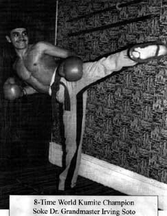 Soke Professor Grandmaster Irving Soto was born in the Bronx, New York in 1954. His parents moved to Brooklyn, New York in 1956. One day his mother took him to the Laundromat to do her laundry, there was this Oriental man called Tashioshi which he owned and operated the Laundromat. In the Laundromat he operated he taught free classes in the back--which he taught only certain kids in the neighborhood; and the classes later on were called Jiu-Jitsu. While his mother traveled back and forth from Brooklyn to Chinatown working, she used to leave her son with a Chinese man who he later found out to be a Shaolin Monk which he taught Kung Fu. Later on growing and respecting him calling him his stepfather. While growing up, he had a thirst for learning the martial arts and he wanted to have extensive knowledge of the martial arts science. He studied them simultaneously to further his knowledge of the martial arts science. In 1968, at age 14, Tashioshi took the young Grandmaster Soto to Japan with other students where he became Kata Champion and Fighting Champion, and Weapons Champion. When Tashioshi moved away from the neighborhood, Grandmaster Soto continued his studies with his stepfather in Kung Fu. At the age of 16 he was already a Sifu in Kung Fu. He continued to further his studies in Jiu-Jitsu with the late Grandmaster Charlie Sparrow and Grandmaster Rudy Jones, and Master Ellis Evans. These were trying times for the young master because there were many street thugs, gangs, rapists, murderers, and con artists in the neighborhood called Brownsville. They challenged him numerous times, but failed to defeat him. These encounters served to be the training grounds for the future World Champion. In 1972, he fought and won the Full-Contact Bare Knuckle Championship in Japan--becoming Bare Knuckle Champion of Japan. As a result of winning the Full-Contact Bare Knuckle Championship 5-times, he was invited to fight in the ultimate full-contact, anything goes, championship called the International Kumite. This is not a point tournament fight. The International Kumite is the exclusive full-contact fight, everything goes open only to family members. Only the best of the best in the world were able to compete by invitation only. The first time he won the Full-Contact, anything goes, Kumite was in 1973. He competed and won a total of 8 times consecutively becoming 8-Time Consecutive World Kumite Undisputed Champion.