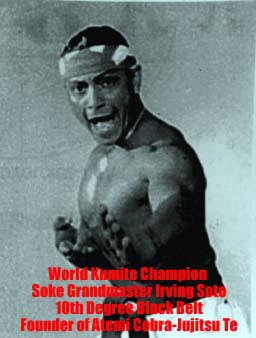 A lot of martial arts instructors claim to know striking methods, as in karate there are 45 attack points waza movements, like kata carry out as in kicking, punching to the temple, to the groins, to the mid-section and so forth. The ancient Art of Atemi was passed down to Grandmaster Irving Soto, 10th Degree Black Belt, who was one of only ten masters, and the only Non-Japanese, selected to learn the Ancient Art of Atemi from Grandmaster Yamamoto. Grandmaster Soto became so proficient in Atemi that he became the first American to receive a Tenth Degree Black Belt (with the color Red), known as the Red Belt in the United States of America. In recognition of his mastery, Grandmaster Yamamoto gave him his ancient Samurai Sword and bestowed him with the title "Warlord". In giving Grandmaster Soto the ultimate warrior and human weapon. In accepting the Warlord; Grandmaster Soto also promised his master that he would make sure the art of Atemi lived on after his master's death. In order to fulfill his promise, Grandmaster Soto has broken from tradition and brought the Orient's greatest secret to the United States of America. At the present time, Grandmaster Soto is the last man alive to posses the complete knowledge of Atemi. Grandmaster Soto developed the Art of Atemi Cobra-Jujitsu Te. The power of ATEMI, the art of striking Grandmaster Soto defines ATEMI as follows: